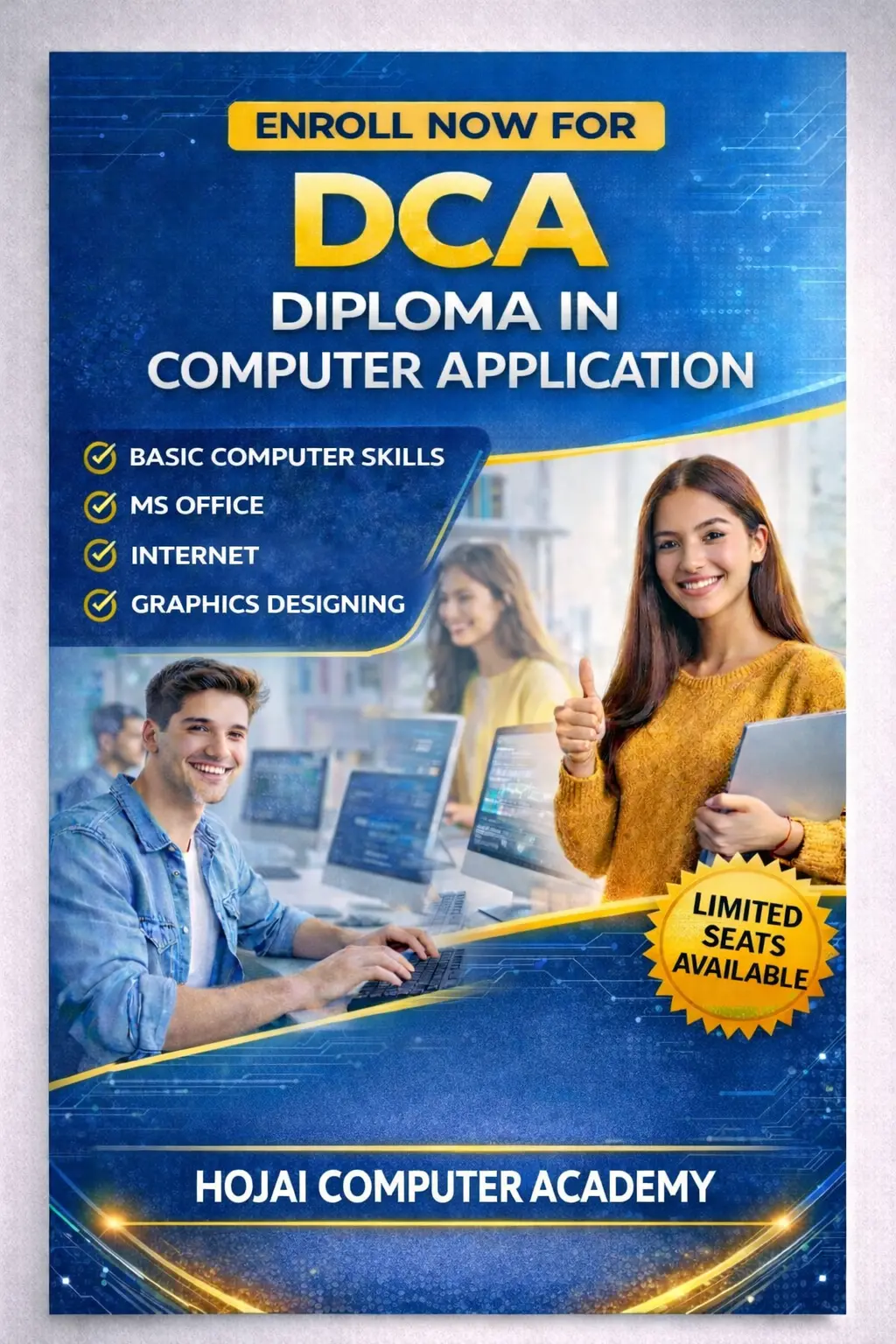 HOJAI COMPUTER ACADEMY has been a trusted name in computer education since 2018, providing quality training and practical learning to students. Recognized as one of the top institutes on Google, the academy is known for its excellence in skill development and student success. We offer a wide range of career-oriented courses including Python, Java, JavaScript, Node.js, MySQL, Ethical Hacking, Digital Marketing, PGDCA, DCA, MS Office, and many more. Our focus is on hands-on training, industry-relevant skills, and real-world knowledge, helping students build strong careers in the IT and digital field. At HOJAI COMPUTER ACADEMY, we are committed to empowering students with modern technology skills and preparing them for a successful future.
